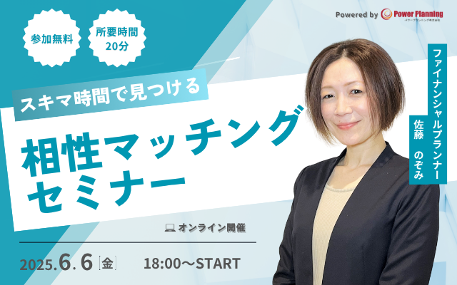 無料マネーセミナー提供サービス「アットセミナー」を運営しているパワープランニング株式会社が「6月6日(金) 12時」に「相性マッチングセミナー」というスキマ時間で自分に合ったFPを見つけられるオンラインセミナーを開催いたします。