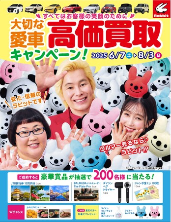 株式会社ラビット・カーネットワーク(本社:東京都江戸川区臨海町、代表取締役社長:山中 雅文)が運営する自動車買取・販売の「ラビット」では6月7日(土)~8月3日(日)まで『大切な愛車高価買取キャンペーン!』を実施いたします。