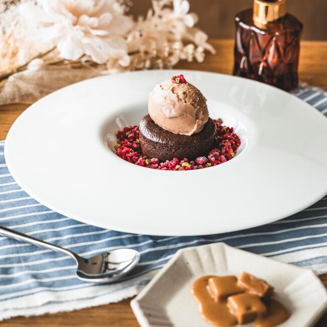 フォンダンショコラは、自家製アイスクリームと、とろっと溢れ出すチョコレートの絶妙なハーモニーをお楽しみいただける一品です。ケーキの周りを彩るフランボワーズとピスタチオがアクセントに。6月10日(火)にしか味わえない、キャラメルフレーバーのアイスとのマリアージュをどうぞお楽しみください。