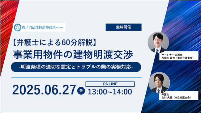「『事業用物件の建物明渡交渉』-明渡し条項の適切な設定とトラブルの際の実務対応-」を無料・オンラインにて開催いたします。