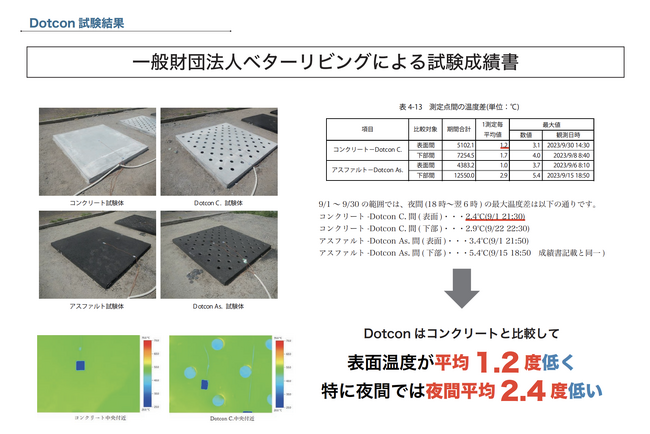 Dotcon舗装の表面温度は、通常コンクリート舗装と比較して→ 平均で約1.2℃低く、