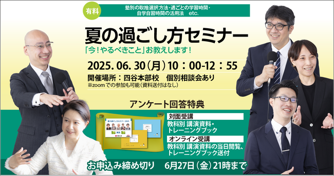 株式会社日本教育指導総合研究所JET(所在地:東京都新宿区、代表取締役:屋口 京子)が運営する中学受験専門の個別指導塾・家庭教師派遣の受験Dr.は、中学受験生の6年生保護者対象の「夏の過ごし方セミナー」を、2025年6月30日(月)に開催する。