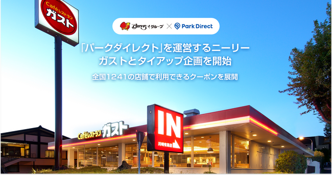 業界No.1(※1)のモビリティSaaS「Park Direct(パークダイレクト)」(https://www.park-direct.jp/)を運営する株式会社ニーリー(東京都中央区、以下「ニーリー」)は、株式会社すかいらーくホールディングス(本社:東京都武蔵野市、代表取締役社長COO 金谷 実、以下「すかいらーくグループ」)が運営する「ガスト」と連携し、パークダイレクトのユーザーに向けたメリット拡充を目的としたタイアップ企画を実施いたします。