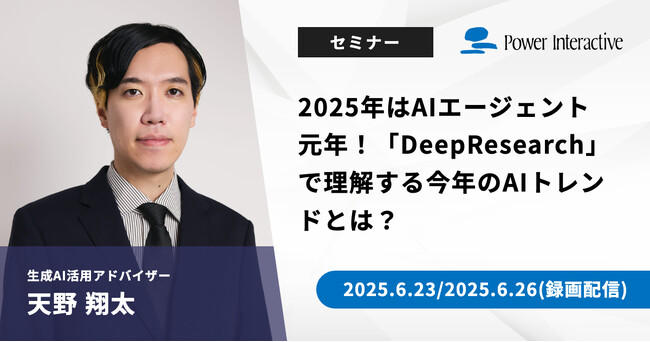 株式会社パワー・インタラクティブは、無料ウェビナー『2025年はAIエージェント元年!「DeepResearch」で理解する今年のAIトレンドとは?』を、6月23日と6月26日に開催します。