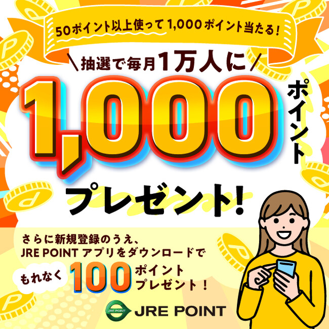 ○本キャンペーンでは、JRE POINTを50ポイント以上ご利用いただいた方を対象に抽選で毎月10,000名様に1,000ポイントをプレゼントします。