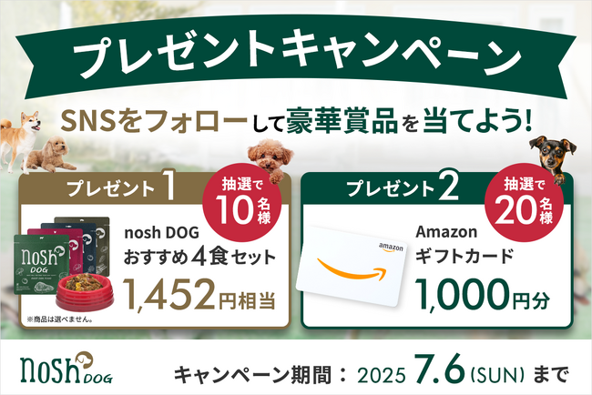 「nosh DOGおすすめ4食セット」または「Amazonギフトカード1,000円分」が当たるプレゼントキャンペーンを開催!
