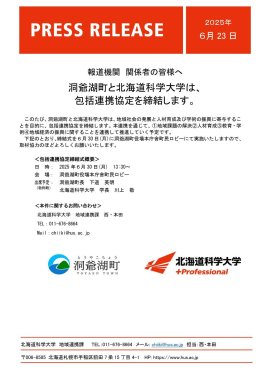 北海道科学大学(札幌市手稲区前田7条15丁目4-1)は、北海道洞爺湖町と地域社会の発展と人材育成及び学術の振興に寄与することを目的に、包括連携協定を締結します。