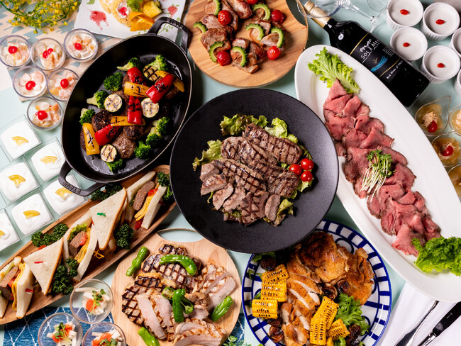 では1Fレストラン「梅ごろも」にて、2025年7月1日(火)~2025年8月31日(日)までの2か月、ビーフ・ポーク・チキンなどの肉を様々な手法や味付けでお楽しみいただく「ステーキブッフェ」を開催いたします。