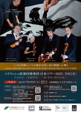 大阪樟蔭女子大学は、べドリッシュ弦楽四重奏団と東野舜水客員教授の特別公演を、3つの芸術と3つの道(書・俳句・西洋音楽)が交差し美の楽園へと導く『月冴ゆる-季語季音-~書・俳句・西洋音楽~』を、 7月19日(土)に開催します。