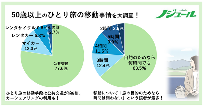 JTBグループで旅行・ライフスタイル情報を提供する株式会社JTBパブリッシング(東京都江東区、代表取締役 社長執行役員:盛崎宏行)は、50歳以上をメインターゲットとする月刊誌『ノジュール』(年間定期購読誌)の読者を対象に、「ひとり旅の移動」に関するWEBアンケート調査を実施しました。