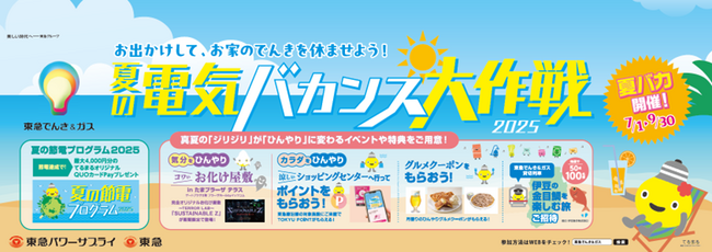 株式会社東急パワーサプライ(以下、「東急パワーサプライ」)と東急株式会社(以下、「東急」)は、東急カード株式会社、株式会社東急モールズデベロップメント及び環境省地球環境局デコ活応援隊(脱炭素ライフスタイル推進室)とともに、“お出かけして、気分もカラダもひんやりしよう!”をテーマとする、お出かけ誘導型節電プロジェクト『夏の電気バカンス大作戦2025』(以下、「本プロジェクト」)を7月1日(火)より開始します。