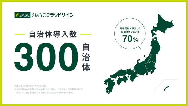 SMBCクラウドサイン株式会社(代表取締役社長:三嶋 英城)が提供するクラウド型電子契約サービス「SMBCクラウドサイン」と、弁護士ドットコム株式会社(東京都港区、代表取締役社長 兼 CEO:元榮 太一郎)が提供する契約マネジメントプラットフォーム「クラウドサイン(R)︎」は、2025年6月時点の導入および支援数が国内の300自治体(都道府県と市区町村)※1を突破したことをお知らせします。