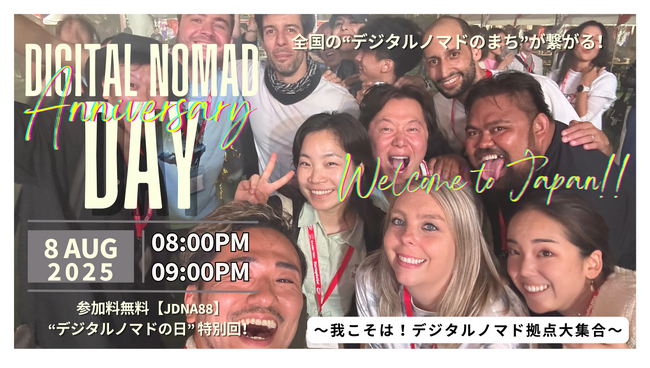 デジタルノマドの国内受入環境の整備や情報発信等を行う一般社団法人 日本デジタルノマド協会(代表理事:MOE 中野智恵、英名:Japan Digital Nomad Association 以下 JDNA、所在地:秋田県山本郡三種町)は、8月8日の「デジタルノマドの日」を記念し、全国の受入拠点がつながる同時ミートアップならびに地域ピッチイベント『JDNA 88 “デジタルノマドの日” 特別回!~我こそは!デジタルノマド拠点大集合~』(以下、本イベント)を開催します。本イベントは、全国各地で拡大中のデジタルノマド拠点がリアル・オンラインでつながる1日限りの特別企画です。各地ではデジタルノマドミートアップを開催する一方で、オンライン上では地域ごとの受入構想や2025年に向けた実施プログラム・挑戦内容などを3分間で発信するピッチイベントを実施します。