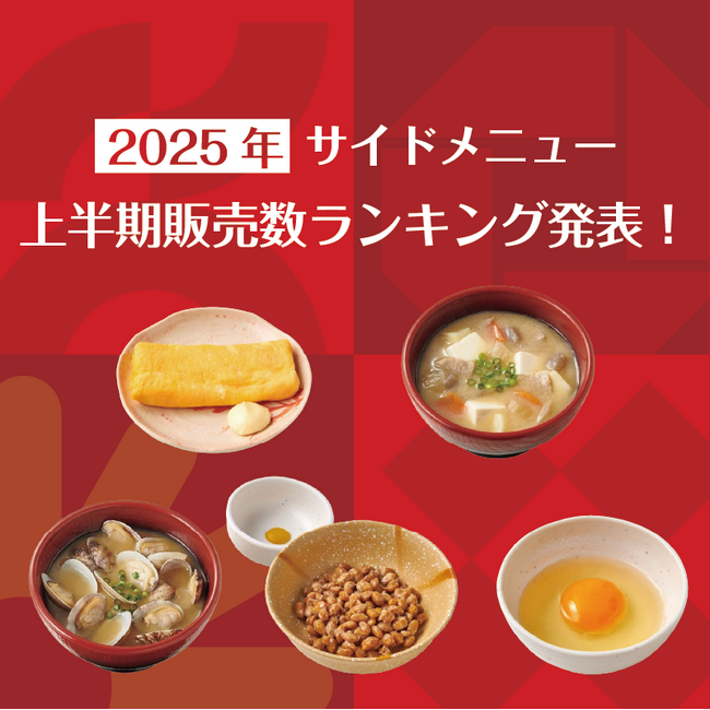 サイドメニューランキングの1位は『玉子焼き』、2位『豚汁』、3位『貝汁』、4位『納豆』、5位『生たまご』でした。昨年の年間販売ランキングと同じランキングの結果になり、5位までの商品は通年ファンが多いようです。