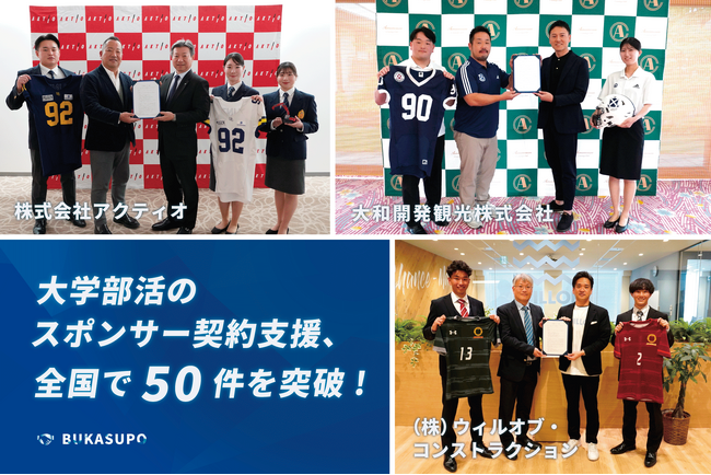 大学部活と企業をつなぐスポンサーマッチングサイト『BUKASUPO(ブカスポ)』を運営する株式会社部活メディア(本社:東京都千代田区)は、このたび、ブカスポを通じて全国50の大学部活動とのスポンサー契約を達成しました。