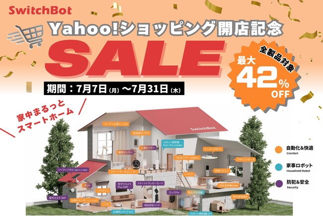 IoT・スマートホーム事業を手掛ける「IoTデバイスNo.1ブランド(*1)」のSWITCHBOT株式会社(本社:東京都渋谷区)は、Yahoo!ショッピングにおける公式新店舗「SWITCHBOT公式ショップ」のオープンを記念して、期間限定のセールを2025年7月7日(月)~7月31日(木)にて開催いたします。人気のスマート製品が、毎日もれなく実施のPayPayポイント還元やセール価格により最大42%OFFでご購入いただけます。この機会にぜひ、話題のスマートホーム製品をお得にご体験ください。