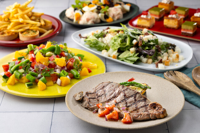 当ホテルのセミブッフェは、まずお席にてメインディッシュをお選びいただいた後、サラダ、前菜、スープ、パン、デザートをお好きなだけ楽しめるスタイルです。今回のメインディッシュは、店名の由来でもある溶岩石(LAVAROCK)でグリルしたビーフステーキまたは魚料理をご用意しており、いずれかをお選びいただきます。ブッフェコーナーには、チキンシーザーサラダやアンチョビポテトサラダなどのサラダ類、キッシュやパスタ、スパイシージャンバラヤといった前菜が並びます。スープは、トマトときゅうりの爽やかな味わいが特長のガスパチョをご賞味ください。デザートコーナーでは、自分だけのオリジナルパフェを作れるコーナーのほか、チーズケーキ、チョコレートブラウニー、ワッフル、紅茶のブリュレなど、多彩なスイーツをお楽しみいただきます。また、お子様向けとして、子供料理のメインディッシュには、グリル野菜を添えたハンバーグをご提供いたします。ブッフェにはキッズコーナーを設け、フレンチフライやからあげ、冷製コーンスープ、キッズカレーライスなど、お子様が喜ぶメニューを取り揃えます。