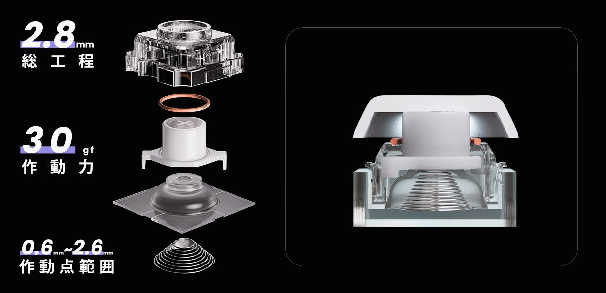 今作ではNIZ従来モデルより更に軽くすべく、専用スイッチを開発して押下圧30gfを実現。