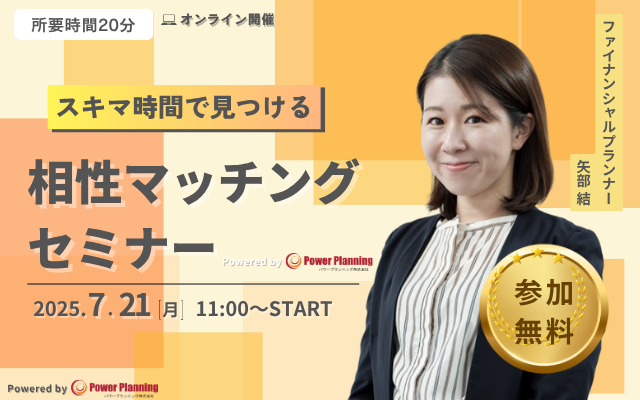 無料マネーセミナー提供サービス「アットセミナー」を運営しているパワープランニング株式会社が「7月21日(月) 11時」に「相性マッチングセミナー」というスキマ時間で自分に合ったFPを見つけられるオンラインセミナーを開催いたします。