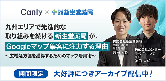 Googleビジネスプロフィール・HP・各SNSの一括管理サービス「カンリー店舗集客」の開発・提供を行う株式会社カンリー(所在地:東京都品川区、代表取締役:辰巳 衛,秋山 祐太朗)は、無料セミナー「九州エリアで先進的な取り組みを続ける新生堂薬局が、Googleマップ集客に注力する理由~広域処方箋を獲得するためのマップ活用術~」のアーカイブを8月5日(火)まで限定配信いたします。