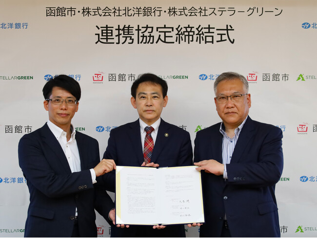 森林カーボンクレジット創出の支援事業を展開する株式会社ステラーグリーン(本社:東京都中央区、代表取締役社長 兼 CEO/CCO:中村 彰徳、以下「ステラーグリーン」)は、北海道函館市(市長:大泉 潤、以下「函館市」)と提携先である株式会社北洋銀行(本店:北海道札幌市、取締役頭取:津山 博恒、以下「北洋銀行」)と、函館市域の自然資源の環境価値の活用等を通じて、ゼロカーボンシティはこだての実現に資する脱炭素型のまちづくりの推進に向けて、3者間で連携協定を締結しました。