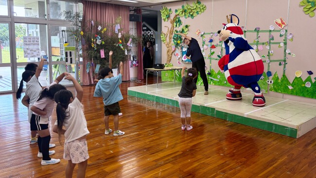 今回の交流では、ゴーディーと一緒にダンスやボール遊びを楽しんだほか、こども園の文化祭にも参加し、笑顔あふれる時間を過ごしました。
