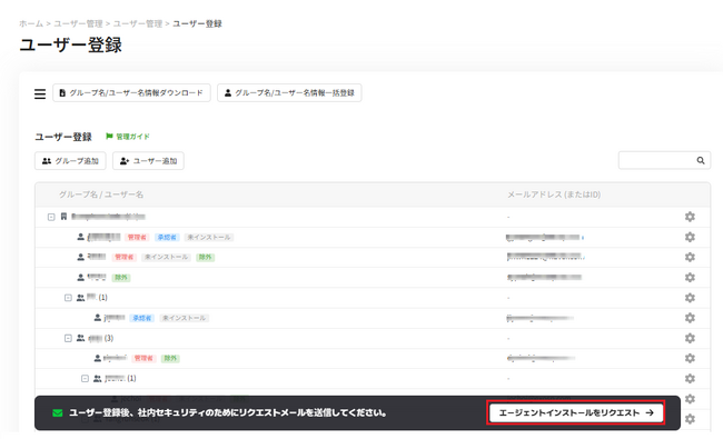 EXOセキュリティはPCセキュリティ製品なので、ユーザー登録だけで完了するわけではなく、エージェントのインストールまで完了していただく必要があります。そこで、ユーザー登録後にインストール依頼を忘れないように、ボタンを追加しました。