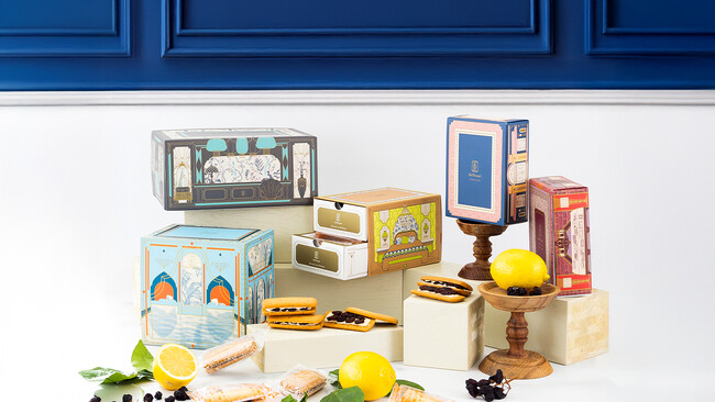ラインナップは、【エントランス】、【スイートルーム】、【スパ】、【ラウンジ】、そして店舗限定の【横浜赤レンガ倉庫限定パッケージ】の全5種。【エントランス】と【横浜赤レンガ倉庫限定パッケージ】は蓋と身の一体式、【スイートルーム】・【スパ】・【ラウンジ】の3種は、多層構造の“引き出し式(ドロワー)”デザインとなっています。すべてのギフトボックスには、定番の「オリジナル」と爽やかな「レモン」、2種のフレーバーを詰め合わせ、1段あたり各フレーバー3個、計6個のレーズンサンドを収めました。