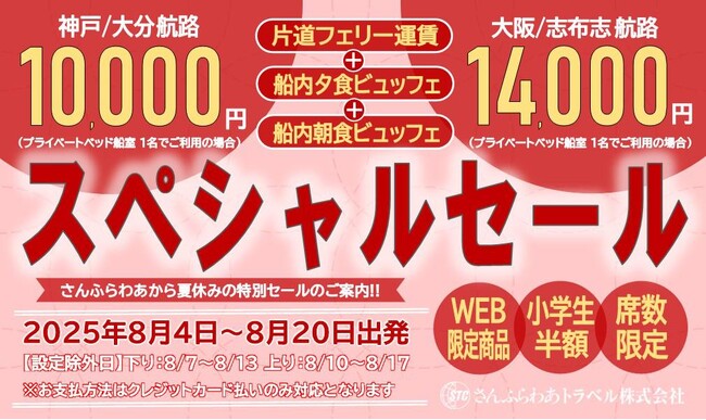 さんふらわあトラベル株式会社(社長:大西 康人、本社:大阪府大阪市住之江区)は、「さんふらわあスペシャルセール」をお盆期間に実施します。