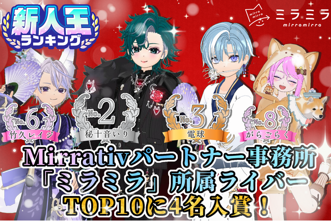 Mirrativパートナー事務所「ミラミラ」所属ライバーが「新人王」にて快挙!TOP10に4名が入賞!