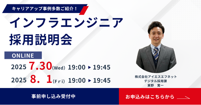 株式会社アイエスエフネット(本社:東京都港区/代表取締役:渡邉幸義、以下アイエスエフネット)は、2025年7月30日(水)および8月1日(金)に、ITインフラエンジニアを対象とした採用説明会をオンラインで開催いたします。