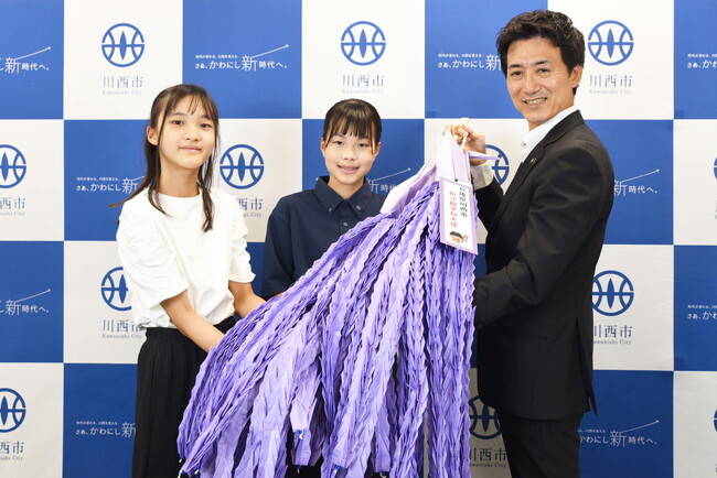 兵庫県川西市では、7月28日、今年の「折り鶴平和大使」となった川西市立牧の台小学校6年生 草島 采和さん(くさじま さわ、12歳)と川西市立川西南中学校1年生 中井 紗映さん(なかい さえ、12歳)が、川西市役所を表敬訪問。それぞれに対し、越田謙治郎川西市長から市民の平和への想いが込められた折り鶴約11,000羽のうち、500羽2束が手渡されました。通算20回目となる今回、2人は8月9日に長崎で開催される平和祈念式典に参列します。