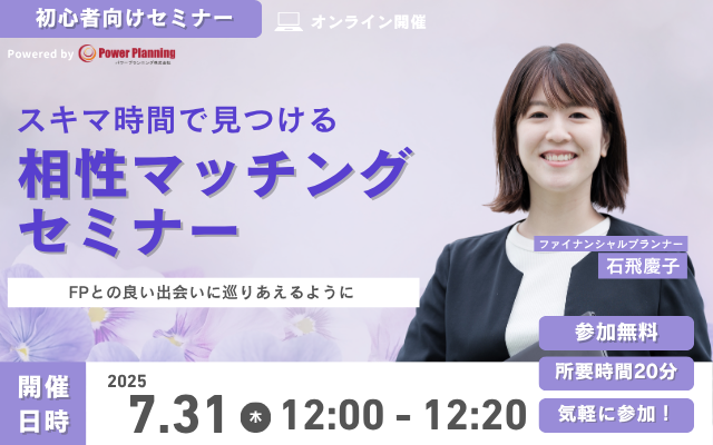 7月31日(木) 12時より、スキマ時間を活用して自分に合ったFPを探すことができる、石飛慶子講師との「相性マッチングセミナー(無料)」を開催いたします