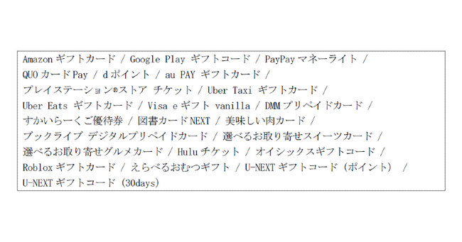 AmazonやGoogle Play、PayPay、QUOカード、dポイント、au PAYなど23種類