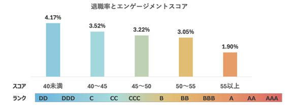 ・スコアが40未満の低エンゲージメント組織群は4%を上回る退職率であった