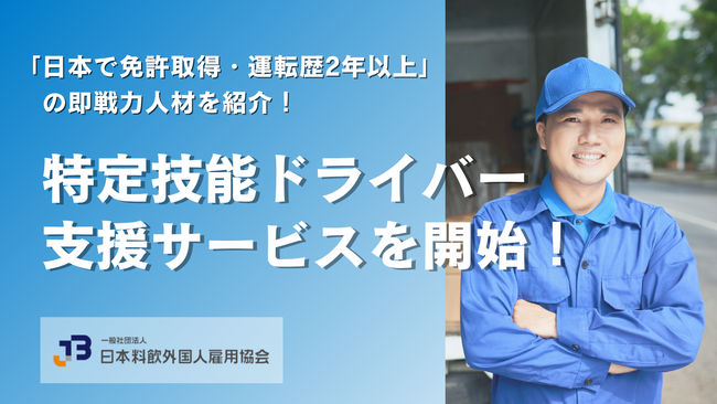 特定技能人材の支援を行う登録支援機関である一般社団法人 日本料飲外国人雇用協会(東京都新宿区、代表理事:田口 直樹、以下 当協会)は、グループ会社であるドライバー人材専門の派遣会社・株式会社ドライブトライブ(本社:東京都新宿区、代表:鷹野 雄太)と連携し、特定技能「自動車運送業分野」向け外国人ドライバー支援事業を開始いたします。