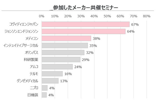 結果は1位「コヴィディエンジャパン」が67%、2位「ジョンソンエンドジョンソン」が64%と同等で最も高く、3位「メディコン」が38%、4位「インテュイティブサージカル」、5位「オリンパス」、6位「科研製薬」、次いでアムコ、テルモ、グンゼメディカル、ニプロ、日機装という順になった。2024年と比較した参加頻度は平均で約5%増加した。