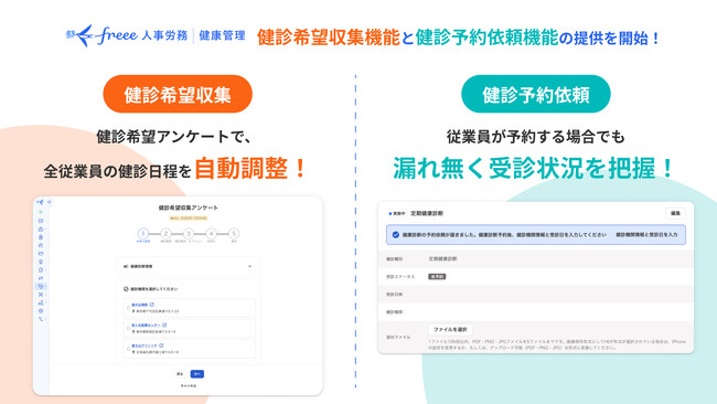 フリー株式会社(本社:東京都品川区、CEO:佐々木大輔、以下「freee」)が提供する、健康診断やストレスチェックにおける回答進捗管理や労働基準監督への報告などの業務を効率化する「freee人事労務 健康管理」において、健診希望収集機能と健診予約依頼機能の提供を開始しました。
