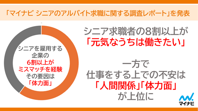 シニア求職者の8割以上が「元気なうちは働きたい」。一方で仕事をする上での不安は「人間関係」「体力面」が上位に。シニアを雇用する企業の6割以上がミスマッチを経験し、その要因は「体力面」