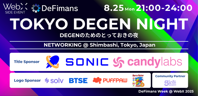 株式会社DeFimans(所在地:東京都港区、代表取締役:小野 暢思・佐藤 太思、以下「DeFimans」)は、2025年8月25日(月)に、web3ユーザー・DeFiトレーダー・コミュニティマネージャーなどが一堂に会するナイトイベント「TOKYO DEGEN NIGHT」を開催いたします。