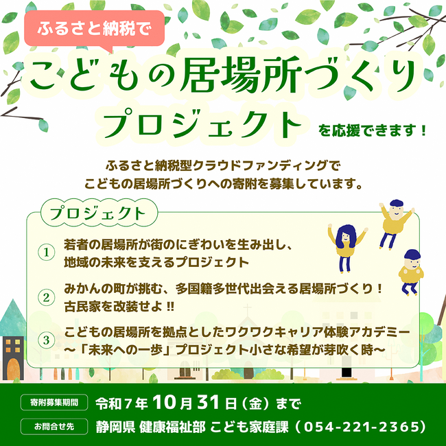 静岡県ではふるさと納税総合サイト「ふるさとチョイス」が提供するクラウドファンディング型でふるさと納税を募る仕組み「ガバメントクラウドファンディング(R)」(GCF(R))で、こどもの居場所づくりの活動拡大に必要な資金調達に取り組む団体による3つのプロジェクトへの寄附を募集します。募集期間は8月1日(金)から10月31日(金)です。