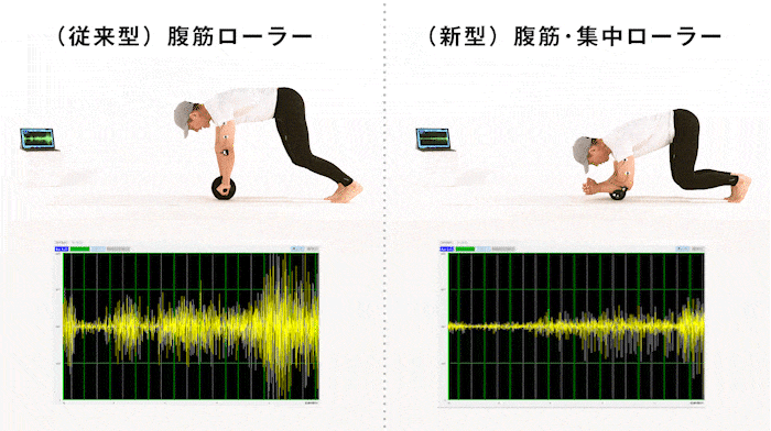 腕の負担を大幅軽減。筋電図で見えた新型の特長。腹筋・集中ローラーは、従来型に比べて上腕三頭筋(腕の裏側)への負担が明確に軽減されます。その分、腹筋に集中しやすくなり、動きにもムダがありません