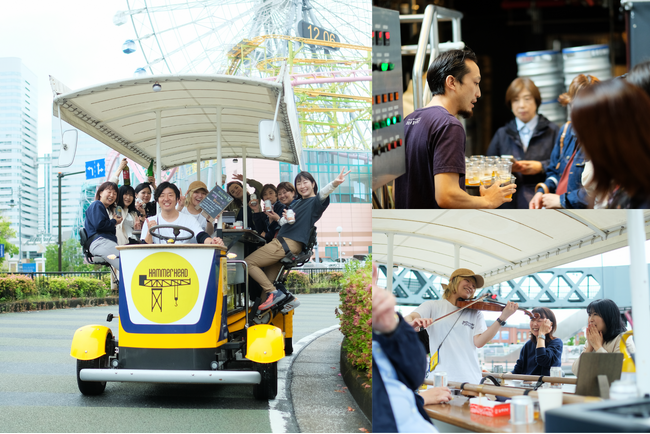 ビアバイクとは、自転車大国と呼ばれるオランダ発祥の「移動式ビアカウンター」です。国内で初めて運用を始めた横浜の「ビアバイクツーリズム」では、6人の搭乗者がビールを燃料に、ペダルを漕いで横浜の街並みとブルワリーを巡ります。また、個性豊かなガイド(中央)と、演者(後部座席)による生演奏が体験を盛り上げます!