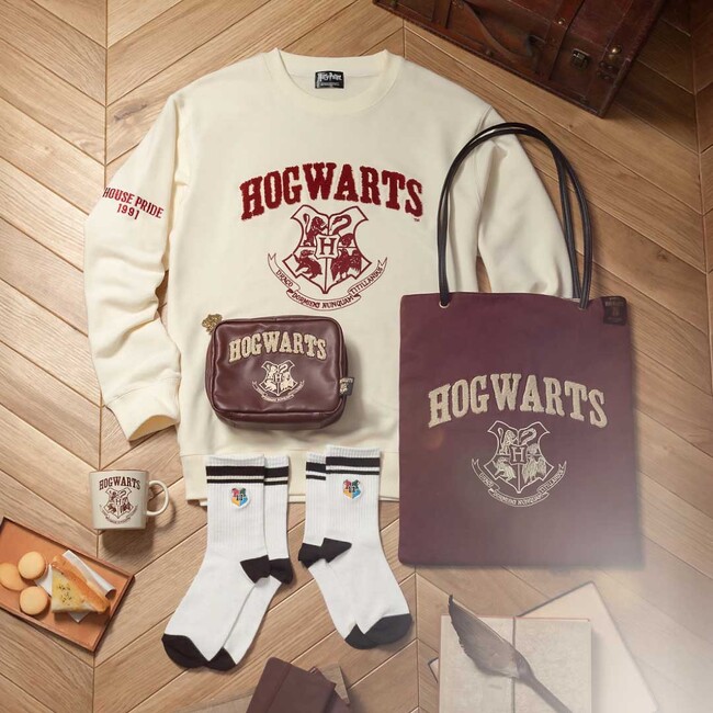 ナチュラルなベージュとブラウンを基調とした普段使いしやすいトートバッグやスウェットでコーディネートを楽しんだり、ラインソックスをパートナーやお友達とお揃いで着用したりと、バック・トゥ・ホグワーツならではの特別なハリー・ポッター マホウドコロの新商品で、ぜひ新学期の準備に勤しむホグワーツ生気分を味わってみてくださいね。