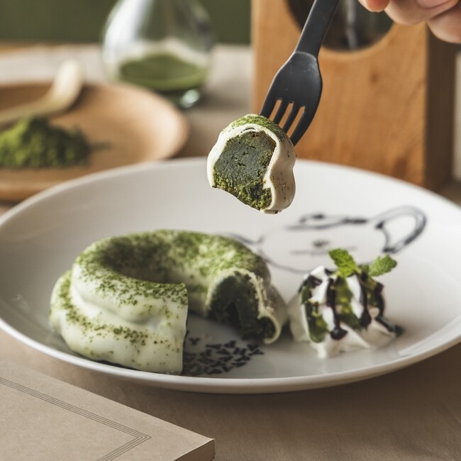 生地を数日間寝かせて作る、ガトーショコラのようなしっとり食感の人気ドーナツから伊藤久右衛門の抹茶をふんだんに使用した限定フレーバーがイートイン限定で登場。表面にはパリッと食感のホワイトチョコレートをたっぷりとコーティングし、抹茶パウダーを散らしました。