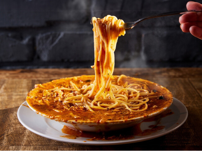 6割のお客様が注文する魅惑の「絶望のスパゲッティ」看板メニューの「絶望のスパゲッティ」は長時間煮込んだ自家製ミートソースに、生クリームとオリーブを加えニンニクと唐辛子でパンチを効かせた濃厚スープソースが特徴のミートトマトクリームスープスパゲッティです。炒めたキノコとベーコンのトッピングがやみつきになる、濃厚かつ複雑な味わいはフレンチ出身の創業者が考案し、その感動的な見た目と美味しさによって多くのファンに長年愛されています。