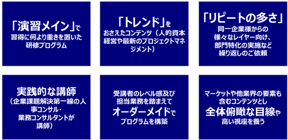 本サービスは、現役のコンサルタントが設計から講師までを担当し、業務改革や人事制度設計など現場支援で培った知見をもとに、実務につながる育成を行います。