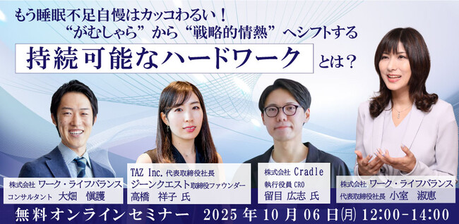 2006年の創業以来3000社の働き方改革を支援する株式会社ワーク・ライフバランス(本社:東京都港区、代表取締役:小室淑恵、以下「当社」)は、2025年10月6日(月)に、スタートアップや成長企業で成果を出し続けるための「持続可能なハードワーク」をテーマにした無料オンラインシンポジウム「もう睡眠不足自慢はカッコわるい!“がむしゃら”から“戦略的情熱”へシフトする『持続可能なハードワーク』とは?」(以下「本シンポジウム」)を開催します。