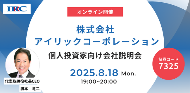 株式会社アイリックコーポレーション(本社:東京都文京区、代表取締役社長CEO:勝本竜二、証券コード:7325、以下「当社」)は、2025年8月18日(月)に、株式会社SBI証券のHP内にて「個人投資家向けオンライン会社説明会」を開催いたします。