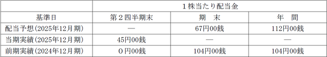 この基本方針のもと、直近の業績推移と経営環境を総合的に勘案した結果、2025年12月期の中間配当金につきましては、当初予想通り1株当たり45円00銭とすることにいたしました。